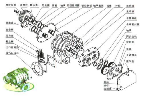三葉羅茨鼓風(fēng)機(jī)與二葉型相比,氣體脈動(dòng)性小,振動(dòng)也小,噪聲低。風(fēng)機(jī)兩根軸上的葉輪與橢圓形殼體內(nèi)孔面,葉輪端面和風(fēng)機(jī)前后端蓋之間及風(fēng)機(jī)葉輪之間者始終保持微小的間隙,在同步齒輪的帶動(dòng)下風(fēng)從風(fēng)機(jī)進(jìn)風(fēng)口沿殼體內(nèi)壁輸送到排出的一側(cè)。兩只轉(zhuǎn)子均固定於一組同步齒輪上,因此轉(zhuǎn)動(dòng)時(shí),汽缸和轉(zhuǎn)子間維持著相當(dāng)微小的間隙,使其不互相接觸,一般情形其間隙大約在十分之幾毫米。因?yàn)楸舜瞬幌嗄Σ?,故可以高速運(yùn)轉(zhuǎn)而獲得大的風(fēng)量或排氣速度。風(fēng)機(jī)內(nèi)腔不需要潤滑油,結(jié)構(gòu)簡(jiǎn)單,運(yùn)轉(zhuǎn)平穩(wěn),性能穩(wěn)定,適應(yīng)多種用途,已運(yùn)用于廣泛的領(lǐng)域。